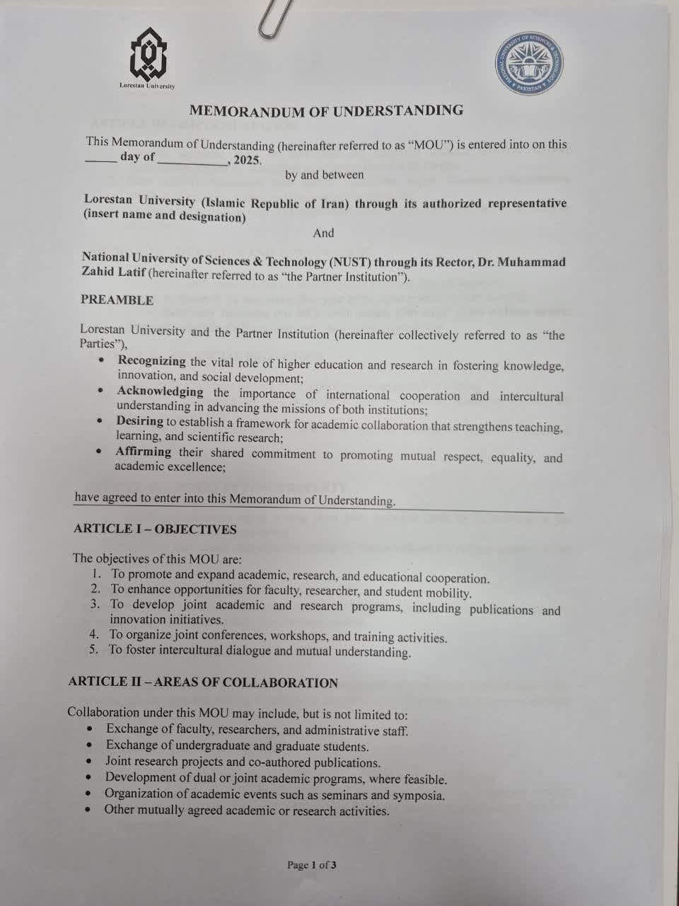 به گزارش روابط عمومی دانشگاه لرستان، برپایه گزارش ارسالی معاونت پژوهش و فناوری دانشگاه، پیرو پیگیریها و مکاتبات رسمی معاون پژوهش و فناوری دانشگاه لرستان در مراسم جایزه مصطفی (ص) در تابستان 1405، رئیس دانشگاه ناست پاکستان (National University of Sciences & Technology (NUST) Islamabad) از رئیس و معاون پژوهش و فناوری دانشگاه لرستان، جهت حضور در دانشگاه خود برای انعقاد تفاهمنامه همکاری دعوت کرد.