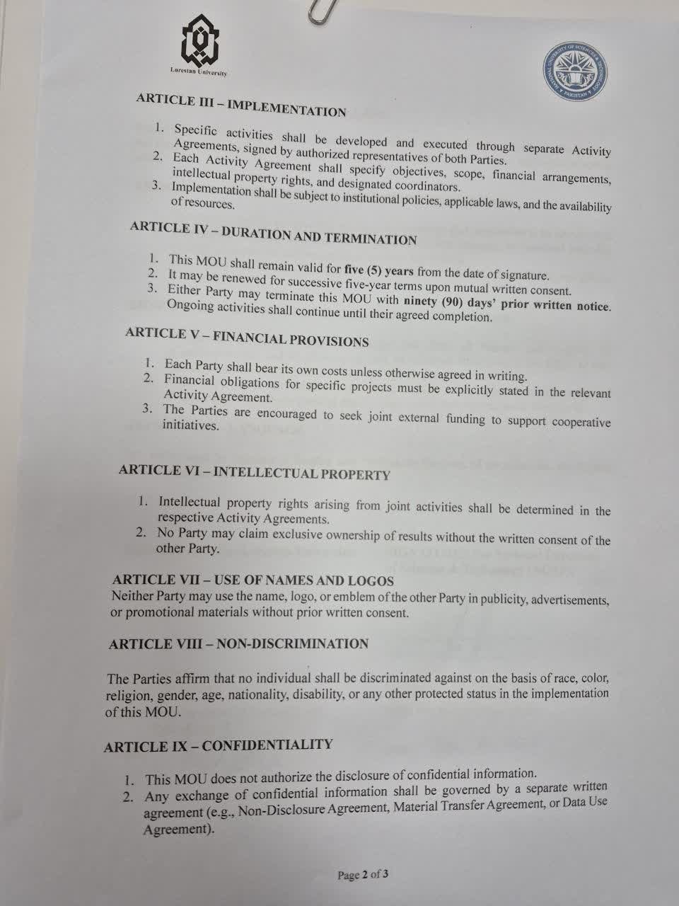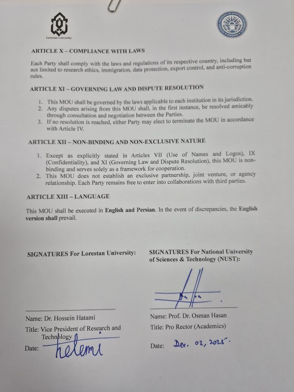 با حضور دکتر حسین حاتمی، معاون پژوهش و فناوری دانشگاه لرستان، تفاهمنامه همکاری دوجانبه، با دانشگاه «ناست» پاکستان، دارنده رتبه اول دانشگاههای این کشور، رتبه 371 کیو اس و 500 تایمز، منعقد و مبادله شد.